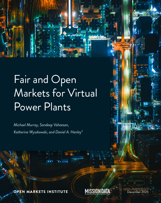 Washington, D.C. — The Open Markets Institute and Mission:data Coalition today published a report, Fair and Open Markets for Virtual Power Plants, on how investor-owned utilities are stifling the growth of virtual power plants (VPPs) and denying customers more affordable and reliable electricity. VPPs offer one of the most cost-effective ways to reduce power costs by shifting usage away from peak hours and reducing the need to build expensive new infrastructure. But monopolistic practices of utilities such as “data blocking” exclude rivals, contribute to sharply rising costs, and increase the risk of blackouts.