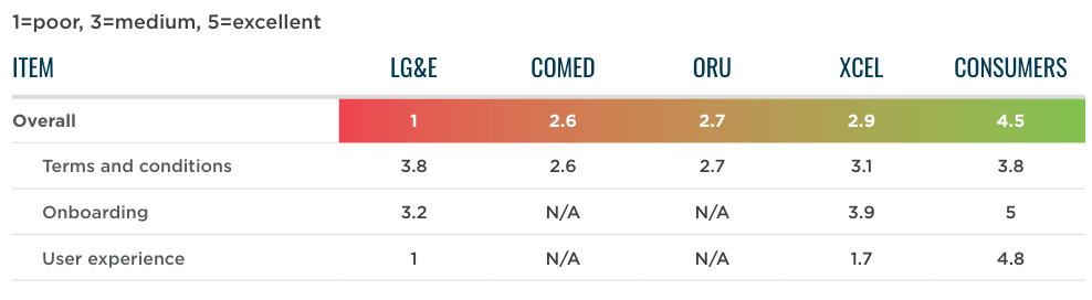 We have long been critical of utilities that misrepresent their Green Button offerings. Utilities have often disappointed on Green Button with broken links, 404 errors and technical defects. Unfortunately, our investigation found that even vaporware remains alive and well in the utility sector. LG&E used its Green Button certification as part of securing approval for a $350 million advanced meter project. But when we asked to use Green Button, LG&E admitted to us that it doesn’t actually exist. As a result, LG&E received the lowest score.